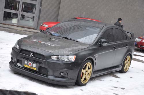 | 這輛足以亂真EVO X的Lancer EX來自瀋陽TT改,全車碳纖維貼紙包覆以及金色的輪圈甚是漂亮,全車EVO X款外觀套件也是看點之一。 |