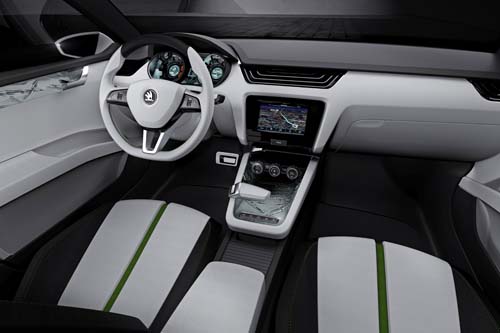 在內裝部份,Vision D亦呈現出Skoda對未來新車內裝設計的思維,或許是因為概念車的緣故,此車的內裝陳設看來非常簡潔,十分特別的出風口設計雖然吸引我們的目光,但對如此的造型是否有機會投入量產,我們則持保留的態度。