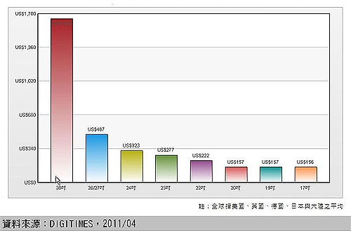 而4月3D機種均價274美元,較3月287美元減少4.5%,隨著產品選擇日益增多,市場競爭越形激烈;針對3D與非3D機種比較,羅惠隆分析,價差已從2010年5月114美元,至2011年4月縮減成83美元,3D機種較非3D機種溢價44.5%。