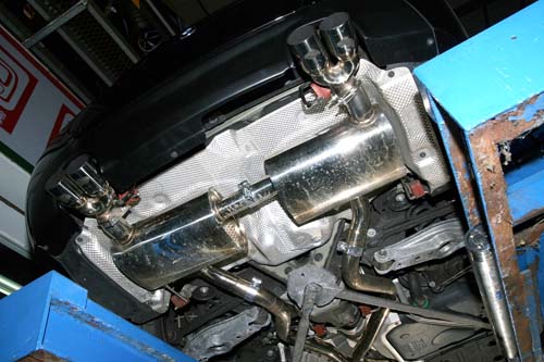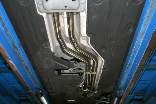 | 中尾段排氣管已改成BCS製品,從照片中可明顯看出原廠四顆觸媒轉換器已經拔除,雖有助於排壓降低,拉長動力延伸性,但若不透過供油電腦程式的修改,於200km/h時會亮起電腦故障燈。 |
