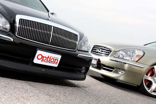 | 左側Nissan President水箱罩為直瀑式設計,Infiniti Q45則為多橫條鍍鉻設計區別。 |