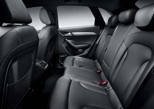 除了Audi一貫優異的車內空間與人體工學之外,Audi在Q3車上也提供了極為多樣的選用配備,讓買主可以打造出獨一無二的座駕,不論是椅面材料或是面板均有多種選擇;而對SUV買家來說相當重要的行李容積,Q3則提供了460公升的容量,在將後座打平之後,容積還可進一步增加至1365公升。在等級較高的車款上,我們也可看見許多高科技行車輔助配備,包括HID轉向輔助頭燈以及新式的停車輔助系統。在車內的影音娛樂方面,MMI當然是配備之一,包含重低音在內的Bose音響系統亦是吸引人之處,而在不久的未來Audi還將提供Q3一套車用藍牙行動電話系統,此一系統還提供WLAN功能,讓車輛直接具有無線網路分享功能。