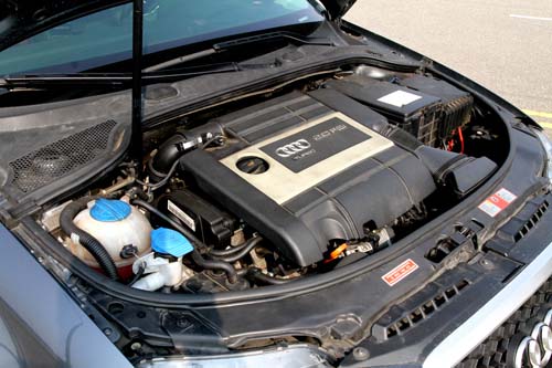 第一輛搭載舊款引擎的灰色A3,打開引擎蓋後只覺得舊舊的一點也不起眼,但是實際上此車卻有相當大幅度的改裝,那就是GIAC的K04渦輪套件,這組套件包含專用的K04渦輪本體、高壓噴油泵浦及加大噴油嘴,而排氣管則換上Sport Tec中尾段,但進氣部分卻沒有換裝改裝套件,為了就是讓引擎室看起來就像原廠一樣,在GIAC的電腦調校後,馬力輸出可達到370匹的水準,此外,還針對變速箱改裝了SSP強化離合器片,讓動力能夠完全發揮出來。