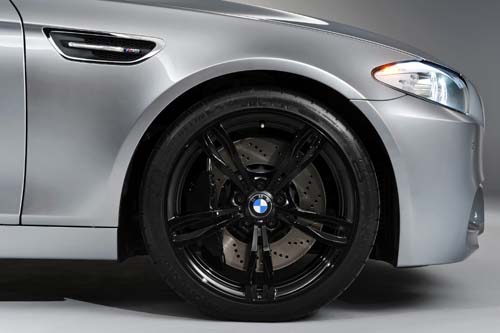 它長得跟前陣子推出的5系列M Sports Package有點像,延續自新一代M家族風貌的空力套件有如M3的放大版,但從前保桿兩側的超大進氣口與突出的迎風導角,皆透露Concept M5在性能與速度方面的高度要求。為符合V8雙渦輪增壓引擎對散熱及高進氣量的需求,前保桿的進氣面積明顯比過去要大上許多,而突出的進氣導角在高速行駛時也強化車頭的下壓力。將視線轉到側面,後視鏡、兩邊側裙看起來雖未有太大的改變,但實際上均為專屬製品,而大幅外擴的前後葉子板輪弧、20吋M式樣鋁圈及跑車化的短行程懸吊,加上專屬的後保桿,讓新M5靜止不動就已經散發濃烈的戰鬥氣息。