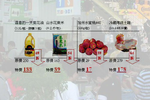 大潤發千種促銷商品全省大會串,即日起至8月26日(日)米、油、水果、泡麵多項商品價格殺到最低,再不進賣場搶購,可就來不及嚕!特別推薦100元有找的「4公斤包裝山水花東米」,54折超低折扣,特價只要89元;得意一天葵花油3.5L一瓶,原價250元,特價只要188,還有還有加州水蜜桃,220g一粒,每粒只要17元;中元普渡,必備牲禮─傳統土雞也有64折的折扣,搭配24小時不打烊,硬是要您不買不行。