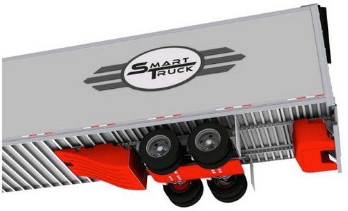 這套稱為「SmartTruck UnderTray System」的卡車空力套件,是專為載重上限15公噸半的18輪大型拖掛卡車所設計,採用五個獨立的空力元件,乃屬於一套綜合型的氣體整流罩裝置,在裝設於卡車底盤後,可有效降低流經貨櫃下方的風阻係數。而根據美國能源部實驗的結果顯示,這組專用空力套件能夠降低柴油卡車7-12%的燃油損耗。