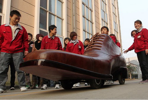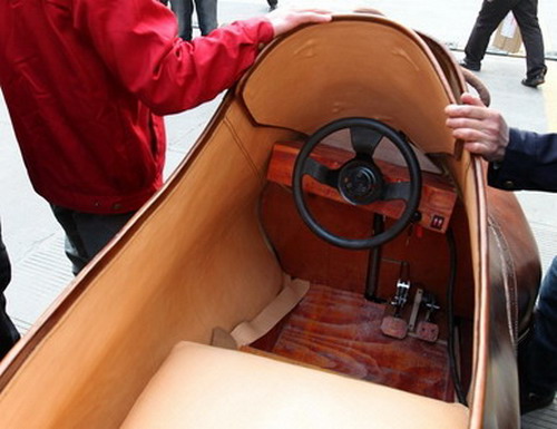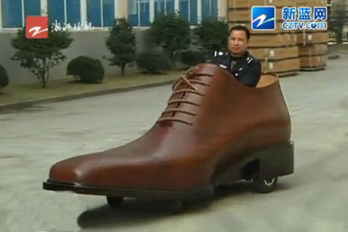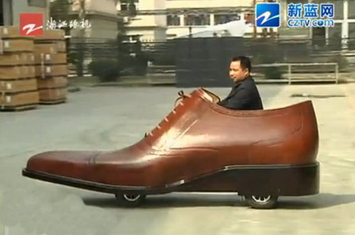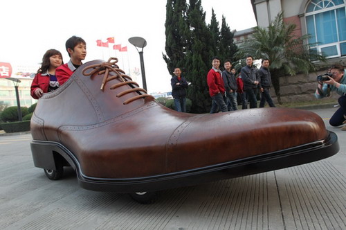 這輛長3米、高1.05米的「皮鞋電動車」是中國浙江溫州的一家鞋廠所製造出,其車身外殼部分乃採用手工縫製的「真牛皮」製成,而車艙內不僅可乘坐兩人外,包括方向盤、油門踏板及煞車踏板等皆一應俱全。而電池組則是配置在鞋底部,在充滿電的情況下,竟然可行駛達400公里,且最高時速也能達到30km/h。