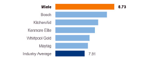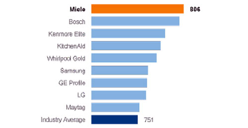 家電業的製造商就一如其他行業的製造商一樣,只要用心都有機會創造出超越顧客期望的傑出經驗。Miele在五項「性能與信賴度」的項目中獲得三項最高分:餐具的清洗效果、能源效率、耐用。Miele在其餘兩項得到第二高分的則為:靜音效果、用水控制。清洗效能是所有「性能與信賴度」檢測中最被顧客重視的,而Miele在這方面出眾的表現,深獲顧客的信賴與滿意。