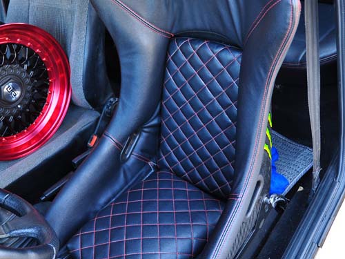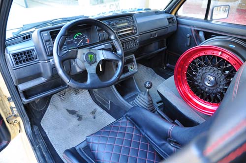 礙於是同一平臺的關係,所以這輛Golf的內裝和先前Jetta的內裝幾乎沒什麼兩樣,只是因為車主喜好的不同而產生的差異,不論是引擎動力改裝還是內裝部分的設定,一切都是以駕駛為主導思想,例如小直徑賽車方向盤以及大耳朵賽車椅。然而真正的看點便在於手柄式的天窗以及高爾球樣式的排擋頭,這些都是Golf MKII所特有的亮點。也正是車主特意將經典鎖定,使之繼續散發著它們應有的迷人味道!
