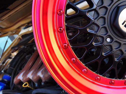 | 用液壓挺桿來撐起引擎蓋已經算不了什麼了?車主特別準備了一顆雙色ESM輪圈來支撐引擎蓋,這才是玩車的最高境界,幾千元的投入只為打開引擎時的別具一格。 |