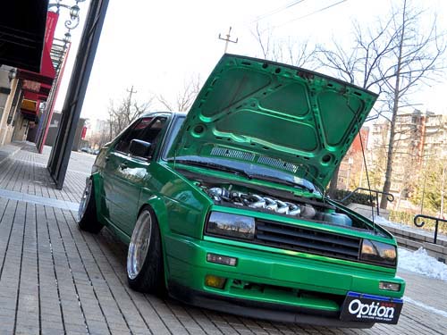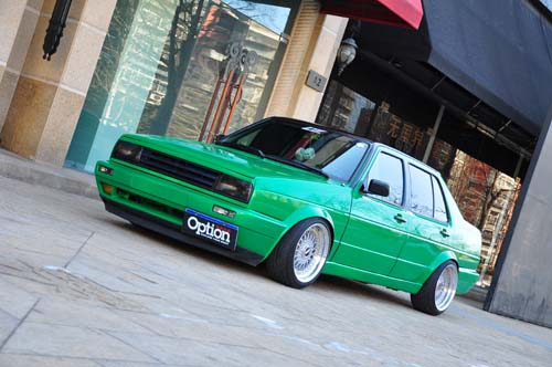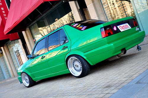 相信Jetta是中國大陸汽車市場中銷量非常不錯的車型,自80年代末引進至今,已經生產銷售了200萬輛之多,前不久更發佈了200萬輛的紀念版車型,並且Jetta也是中國大陸第一個宣導駕駛樂趣的車型,雖然它不能和現在的車型所媲美,但在當時來說,Jetta的操控性確實非常好。要想在全國200萬輛Jetta中脫穎而出,確實非常困難,因為數量實在太過龐大。而且車身造型又非常平實內斂。不過看到這輛綠色的Jetta之後,筆者認為車主真的非常用心,能把這麼一輛滿街都是的車改裝得如此搶眼,確實需要下一番功夫,那麼這一身綠色的烤漆顯然已經完成了至少50%的改裝。