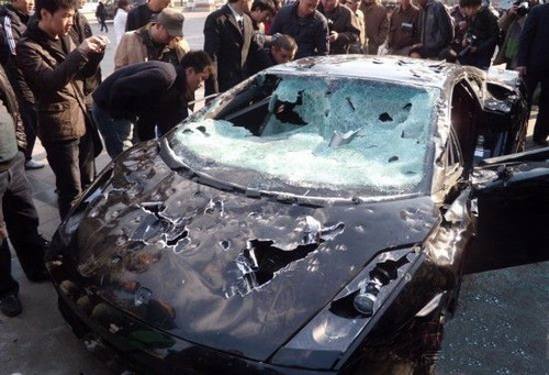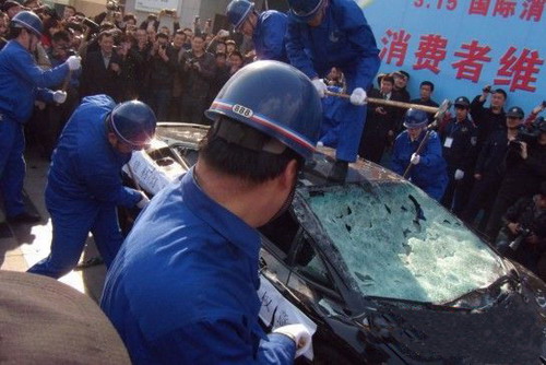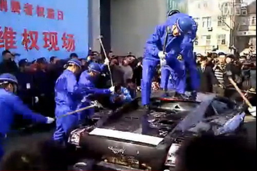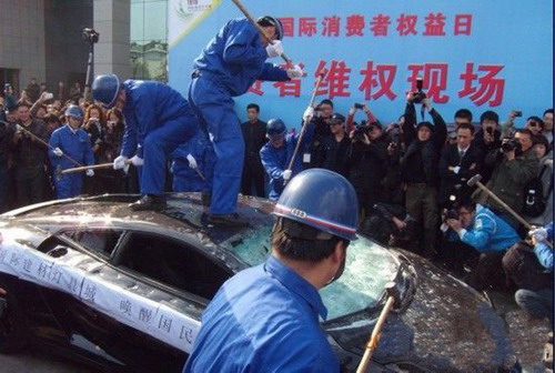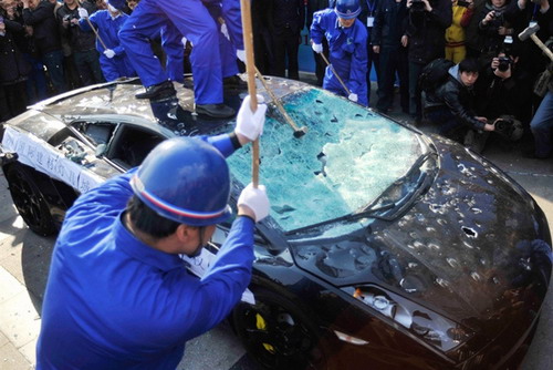 而這位Gallardo車主在四處碰壁之後,心中就想著到底要用什麼樣的方式與手段來保護自己的消費權益,最後他認為要獲得原廠與大家關注的最好方式就是將車子「砸毀」!因此他選擇在「世界消費者權益日」,將車子運到Lamborghini的保養廠門口,並特別請了8名工人,拿著大鐵鎚聯手將這輛Gallardo給敲毀,希望藉由如此激烈的手段來獲得廣大民眾對他的支持,同時也對Lamborghini深表的強烈的不滿與抗議,冀望原廠能夠將他們最引以為傲的優質服務拿出來對待中國的消費者。