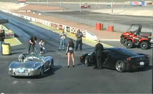 這場高額賭金的競速比賽,是在美國拉斯維加斯Motor Speedway racetrack的零四賽道上進行,兩車先在跑道上單獨試跑一次,結果Shelby Cobra 427以10.758秒的零四成績,小幅贏過458 Italia的11.217秒。起初458 Italia車主Tom Goldstein還不敢置信成績居然會輸給古董跑車,因此在正式上場對尬時完全不敢掉以輕心。而在兩車拿出真本事拼輸贏之後,最後仍是Shelby Cobra 427以10.745秒(通過速度212.6km/h)的成績,勝過458 Italia的11.543秒(通過速度195.1km/h),由Dan Bilzerian搶下40萬美金的賭注!
