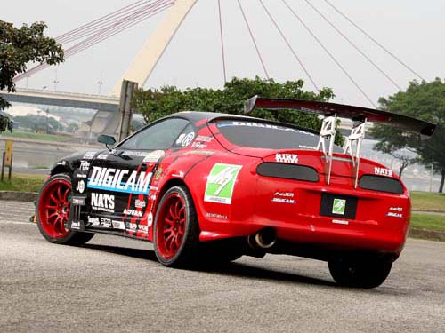 當車輛運抵現場時,伴隨著凌晨四點左右的昏暗氣氛,讓這輛Supra更散發出即將好戲上演的感覺,這輛車的外觀以RIDOX全數空力套件為基礎,另外在搭配上TOMDX 3D GT尾翼及VRIS製碳纖維引擎蓋,而無論是進口還是國產,FRP件的空力套件,都是需要大量補土才有辦法烤出完整的平面,如果步驟有偷工烤漆表面一定會呈現輕微的波浪狀,在激烈的D1 GP賽事中雖然常會有碰撞意外,不過NATS團隊依舊沒有偷工,寬體、前後保桿及側裙的表面及與各鈑件的間隙都處理得恰到好處。