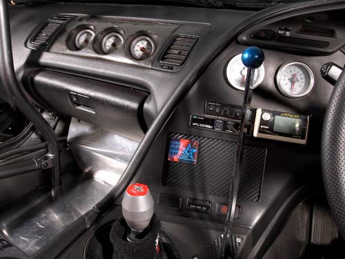 | 由於並非一號機,所以變速箱部分還是採用原廠六速手排,手煞車則是採用油壓設計來減少甩尾時的失誤,由於原廠儀錶並未廢除,因此必須另外追加來監控車輛狀態。 |