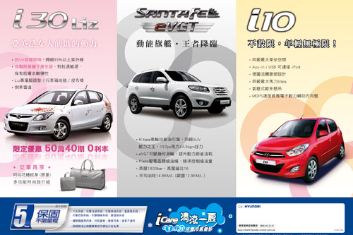 總代理南陽實業表示,提高產品保固是因為對顧客在現代汽車品質上的保證,且為了回饋消費大眾對現代汽車的愛護,也不時推出優惠顧客、體貼顧客的方案。像五月中上市的i30 Liz版,就是專為女性朋友設計的專屬車種。為讓女性朋友不受紫外線侵擾而變成〝黑美人〞,特在原廠便配置了抗UV前擋玻璃,可阻隔紫外線達99%以上,且不會因為須在前擋加貼隔熱紙而形成晚間視線不良的危險冏境。另外在車內還配備了專門對抗過敏源,且具有保持肌膚水嫩彈性的自動除菌負離子產生器。還有專屬的Liz腳踏墊、行李箱地毯、皮布椅以及女性車主最喜歡的倒車雷達。除這些女性專屬配備外,還有限定優惠50萬40期零利率的專案,交車還送多功能時尚旅行組。