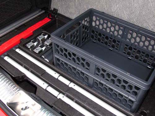 | 地板下方提供Easy-Pack Fixing Kit(選配),將折疊式置物箱、金屬隔屏、伸縮固定帶、活動掛鉤與固定網完整擺放在模組化的凹槽中。 |