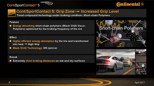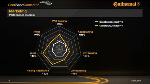 於今年三月在日內瓦,Continental正式推出了新一代的ContiSportContact 5,相較於現行的CSC 3,經過長時間研發、測試並加入最新化學配方的全新CSC 5,若只用兩個字來形容其整體表現,那就是「完美」。據原廠提供的資料顯示,CSC 5輪胎除了操控性與煞車距離均有更為優異的表現之外,滾動阻力甚至更減少10%,耐用度與使用里程數也增加達13%。性能表現之所以出現大幅度的成長,最重要的關鍵除了經驗累積與技術進化外,一項重要的研發成果就是──黑辣椒(BlackChilli)橡膠技術。比起早一步發表的CSC 5 P,兩者在設計概念與技術方面並沒有太大差別,主要僅在於規格及車種的設定,CSC 5 P適用於輪圈規格19吋以上的高性能車與超跑,而CSC 5則是針對輪圈尺寸介於17~18吋、輪胎扁平比50~35、極速300km/h的性能車所設計。另外也有生產SUV適用的規格,輪胎扁平比介於55~45之間,輪圈尺寸17~19吋,極速同樣為300km/h。