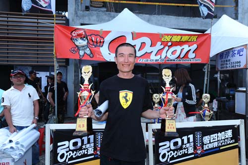 | Top Speed獎(最快末速度)車號:148姓名:陳榮瑞店家:F1車輛:R35 GTR成績:245.45km/h得獎感言:很高興這次能夠代表F1參加比賽,車輛方面雖然改裝了F1自行開發的GT700R套件,但是周邊卻沒有大幅度升級,就連排氣管處煤也都還保留,且變速箱也沒有進行強化,因此沒有採用彈射起步模式,雖然沒有得到零四的冠軍,但是得Top Speed獎也算是一個肯定,希望Option繼續加油,讓玩車的環境更好! |