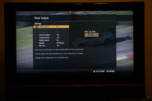 在進入主選單前,玩家需要先經過一番試煉,駕駛GT-R R35跑出最速單圈與擊敗對手,此步驟結束後可設定輔助系統難度和對手強弱,在五種難易度中,筆者建議有經驗玩家可從「Pro」開始,具有駕駛車線可熟悉賽道、車損僅限於外觀不影響性能、循跡設定中間等級,至於電腦AI程度,若不想太折磨自己的話,「Easy」設定下對手普遍進彎煞車較早,玩家可利用此弱點超車。值得一提的是,如果不小心發生擦撞,在車內視點會感受到強烈震動,甚至發生駕駛暫時暈眩(畫面模糊、景物黑白)的情況,所以建議還是離電腦AI或牆壁遠一點比較好。