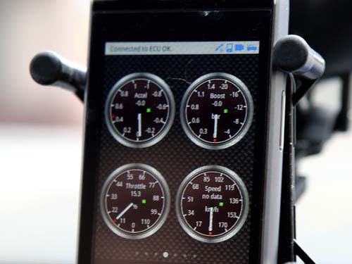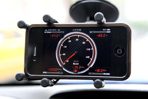 但如何有效利用軟體與行車資訊做整合就是一個大學問,畢竟所有行車資訊要能更呈現出最精確的資料唯有行車電腦最為準確。為此蘭吉特別推出採用無線傳輸的Sgear OBD 2 Scanner,有效利用原車OBD 2直接將原廠電腦所有資訊讀出,若是能夠配合更為完整的軟體使用,不論i Phone或者i Touch等都能作為接收端使用。由於本產品是利用無線傳輸,因此Sgear OBD 2 Scanner本身即具有Wi-Fi功能,無須任何資訊傳輸花費就能將資料傳輸至i Phone,而透過軟題讀取原廠電腦資訊再進行轉化方式呈現,以本次所測試的Impreaza車型來看包含渦輪增壓值、水溫、轉數、加速G值與節氣門開度都能清楚顯示。能夠有效利用i Phone等螢幕來顯示所需的行車資訊對於喜愛3C產品又涉略改裝的玩家而言確實算是相當超值的投資。除了Apple系統可以進行搭配之外,Android系統的傳輸設備也在近期已正式開發完成,由於Android系統可利用藍牙進行資料傳輸,在內建的晶片處理器成本較低的狀況下實際售價只需2000元,而Sgear OBD 2 Scanner則需3500元,只要車型在1996年後並有OBD 2即可使用。