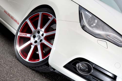 | 外觀部分,就屬腳下四只紅銀雙色的18吋MTM鍛造鋁圈最為搶眼,輪胎尺寸也從原本的215/45/16升級成215/35/18,也因此使路感方面有顯著的提升。 |