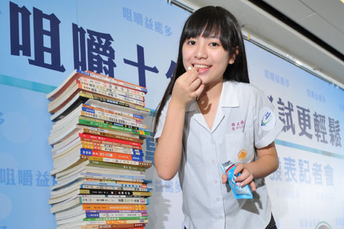 今年6月中旬,台北市補教協會調查2,000名考生發現,逾8成的考生面對即將來臨的指考感到焦慮,高達9成考生覺得自己被時間追著跑、好像書永遠念不完。而在專注力方面,近9成考生念書時感到難以專注且念過就忘,超過9成考生表示在寫無聊或沒興趣的習題時因為無法專注導致疏忽而出錯,顯示多數考生都有考試焦慮或無法集中專注力的困擾。今年正要應考的楊同學表示,她每天唸書都超過12小時,要準備學校小考、段考、模擬考,一年大大小小考試至少超過300次,如果有補習上課的同學考試次數還會更多。楊同學說:「剛報名指考的那一陣子,想到即將面對的考試壓力,心情就很沉重,讀書也沒什麼效率,分數進步空間非常有限,甚至有些退步。後來因為擔心自己心情越來越憂鬱,所以去看了醫生,醫生說每天嚼嚼口香糖、做做伸展操,就可以幫助自己心情放鬆點,也有助於活絡大腦、提升專注力,沒想到我不但因此找到紓壓方式,心情輕鬆了之後,成績也越來越進步!」近來模擬考楊同學的成績持續進步,現在她對於指考信心滿滿。