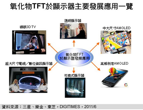 依全球FPD廠商於氧化物TFT技術發展動向來看,其應用面涵蓋3D TV面板、可撓式顯示器、透明顯示器、超大尺寸電視/數位資訊顯示器等應用領域。