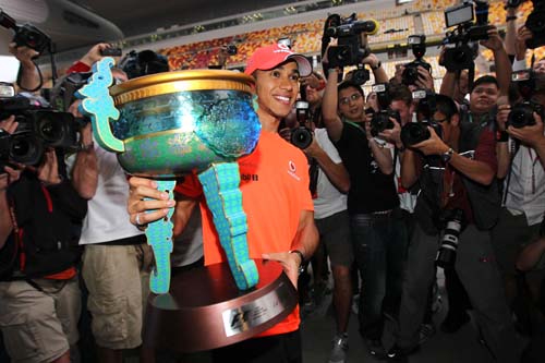 | 中國站L.Hamilton硬是靠著比對手多換一次胎的抓地力,打破壟斷局面。 |
