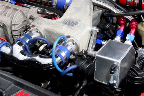 | 這套ISIS機械增壓就是對應MKIII 2.0升8V引擎專用,因此在安裝上完全沒有任何需要修改的部分,車主僅將所有固定橡膠換上SAMCO強化品確保整體穩定度,另外廢油回收桶及管路也都是一併購入,放眼望去還真是充滿濃濃的東洋改裝風味。 |