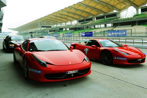 | 米其林安排了兩部Ferrari 458超級跑車及兩部BMW M3硬頂敞篷跑車,作為這次的測試車種,而由這兩款車也即可看出Pilot Super Sport的市場定位。 |