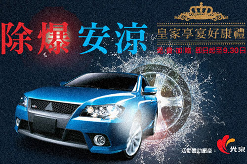 1.進廠即可免費享有『皇家享宴好康禮』。皇家健診:冷氣空調系統+輪胎檢查。包括出風口冷度檢查,冷媒補充(300g以內)特惠價199;輪胎胎壓量測與免費充填等,還請您喝茶消暑。SUM寶寶芳香片(7/15後限量供應,送完為止)