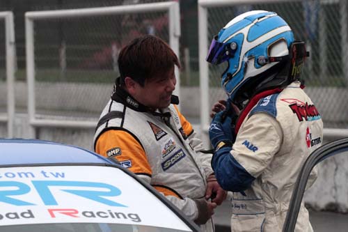 | yu speed車隊2號楊志忠賽後恭喜帶著安全帽的簡俊祥,兩人開心討論戰況。 |