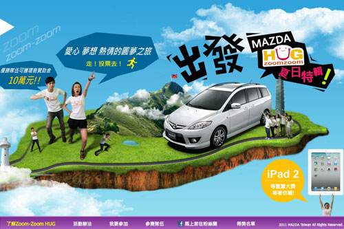 「Zoom-Zoom HUG夏日特輯」網路投票活動將從7月1日起,至7月13日截止,只要參與活動票選,並持續關注MAZDA「Zoom-Zoom HUG」夏日特輯活動,就有機會獲得最新潮流平板電腦iPad 2!還有不定期推出限時問答精美小禮物等你來拿!想知道有哪些熱血青春大專生參與徵選,以及他們的愛心公益訴求,快上活動專頁隨時了解最新進度。每天都能登入活動網頁並投下你神聖的一票,投票次數愈多,不僅能給心目中最佳隊伍更多支持,也增加你得獎機會喔!