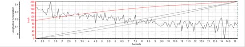 在經過適切的動力及底盤設定之下,在100~150的速度區間也能踹出5.29秒的成績,其最大加速G值更瞬間發生在115km/h的車速,在經過一番努力之後,順利取的15秒內的進場門票,以14秒76的時間及656.66公尺的成績做收,以曲線圖來看,平緩下降的加速扭力是影響成績的關鍵,若是可以再拉長扭力輸出時間帶,或是直接修改排氣管電動閥門開啟時間,說不定就能順利踏入14秒內的成績。(Up rev動力晶片+SRR加大進排氣100~150km/h=5.29秒、達成距離=186.08公尺、100~200km/h=14.76秒、達成距離=656.66公尺、最大加速G值=0.47G(115.4km/h))