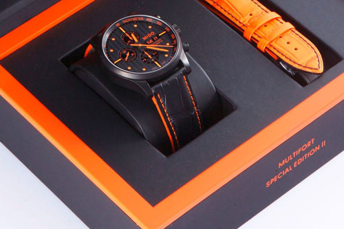 MIDO 美度表在2011年首度推出雙錶帶設計的Multifort Special Edition II先鋒系列典藏黑橘限定腕錶,品牌限定橘黑錶帶展現兩棲型男鮮明性格,該錶款搭配優雅黑及活力橘兩款可替換的小牛皮皮帶,全面提升錶款的時尚穿搭性,賦予Multifort先鋒系列錶款嶄新風貌,讓型男遊走於正式與休閒之間,隨型自我演繹錶款魅力。該系列完整推出大三針與三眼計時兩款不同功能腕錶,錶面直徑分別為44與42mm,三點鐘位置配備星期/日期顯示,其精緻巧湛的機芯,透明底蓋可透視精緻日內瓦波紋裝飾機芯和側面的錶耳比例,增添獨特完美性。黑色PVD真空氣體沉澱處理錶殼,細緻的黑日內瓦波紋錶盤呈現先鋒系列火車側身波浪板的設計靈感,橘色指針及刻度清楚映現於盤中,亮眼橘色十字與點狀刻度低調簡約,面盤在黑、橘色調中呈現精緻時計美感。防水可達100公尺,強力橘色夜光Super-LumiNova線條,在黑暗中和水中更容易辨識。風格前衛引領時尚潮流。Multifort Special Edition II更搭配專屬限量錶盒,盒身內以橘色火車頭線稿塗鴉,點出Multifort先鋒系列的設計靈感來源。