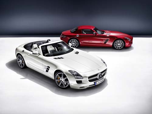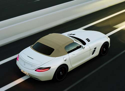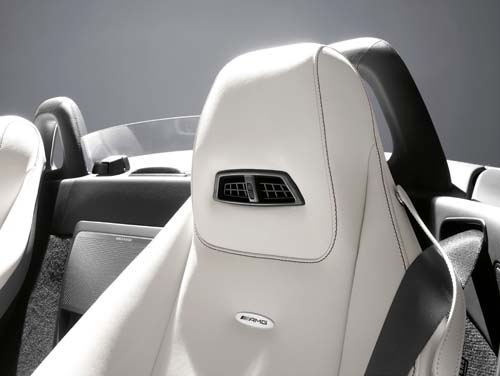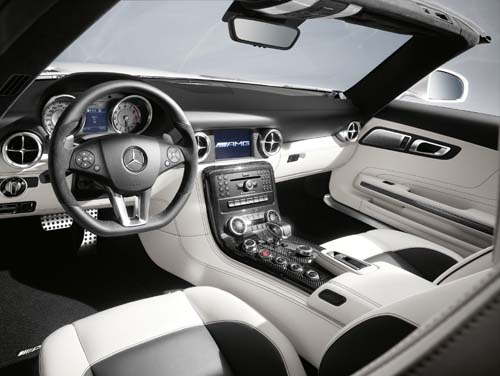 與SLS AMG Coupe車型傳承自同廠1950年代的300 SL Gullwing車型的設計起源相同,採用電動軟頂敞篷設計的SLS AMG Roadster車型,同樣也是以1950年代的300 SL Roadster古典敞篷跑車為師,並擁有類似的大面積水箱護罩、大型三芒星廠徽與車身側面的鰭狀進氣口等設計特色。其內裝基礎鋪陳與Coupe車型並無明顯差異性,同樣沿用飛機駕駛艙的設計精神,與猶如噴射引擎般的空調出風口造型。但為因應敞篷行駛的舒適與便利性需求,M.Benz著名的AIRSCARF頸部暖氣系統當然也不會缺席,搭配頭枕後方、以皮革包覆的翻滾防護裝置,提供相當全面的駕馭快感。