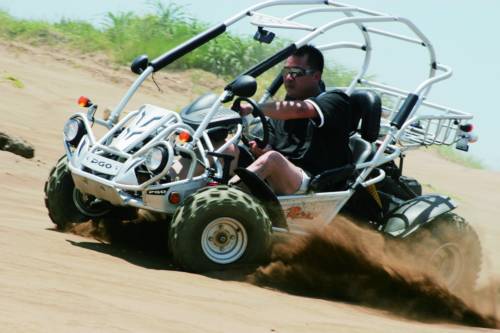 坦白說要在眼前這片海灘上縱走,也不是簡單的事,尤其是此車若要進行攀爬攻頂,絕非一般人能辦得到的。礙於輸出有限,只能儘可能的利用長距離提速,然後衝向坡面或是小坵,之後得順勢而下,為下一個坡面而保持速度。在這過程之中,筆者獲得越來越快的速度,這時終於可以發揮此車的性能,不論是甩尾或是反打,在這時候赫然發現BugRider變得更為迅猛。不過要特別注意的是,當車輛有側向G力時,如果輪胎有被彆腳的感覺,就得立刻再反打,改變車輛重心以避免舉腳側翻。我們只是小試了一下BugRider,可以想像在山林間,它能帶來多大的樂趣,功能絕對比ATV更強大,比SUV更好開。
