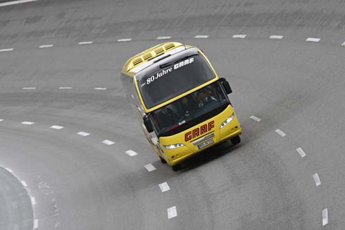 | 你會許曾見過市售房車在高速週回道進行測試,但是屬於大型交通運輸的巴士一樣能在此進行「高速」測試。 |