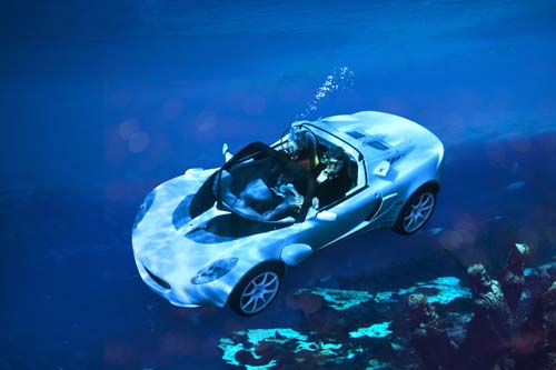 「Dive again,James」,1977年由羅傑摩爾主演的007電影「The Spy Who Loved Me」,片中能夠潛水的跑車讓人記憶猶新,不過電影劇情要當真在那個年代上演或許有問題,不過對現在來說沒什麼不可能,Rinspeed sQuba可是貨真價實的潛水車。sQuba能潛入10公尺的水深,也可以在海底慢慢行駛,動力源捨棄傳統的內燃機引擎,取而代之的是位於車輛後方、由鋰電池驅動的三具電動馬達,一具負責在一般道路上時帶動車身,另外兩具則是負責潛水時的動力,提供車輛前方兩具Seabob噴射馬達所需的電力。Rinspeed老闆Frank M.Rinderknecht講到一個重點,「我們之所以設計sQuba為敞篷車的最主要原因,是因為在緊急情況時車內乘員能盡快脫離車內。」擁有良好的逃生裝置,才是潛水車最重要的條件!這倒是還滿Kuso的。