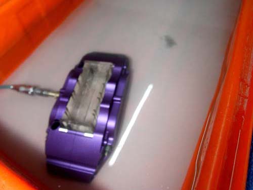 | 攸關生命安全的煞車卡鉗部品也須經過嚴格的高壓氣體加壓測試,一但發生洩露的狀況這組卡鉗絕對會列為不良品淘汰。 |