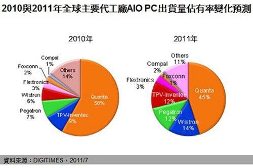 DIGTIMES Research資深分析師兼主任簡佩萍分析 ,2011年在聯想(Lenovo)與惠普(HP) AIO PC兼具量與成長性下,取得兩品牌代工訂單的業者,包括緯創、和碩與英冠達等,將有亮眼表現,3者並將成為廣達以外,佔全球AIO PC出貨比重可達10%以上的代工廠,而第1大代工廠廣達在主力客戶蘋果(Apple)成長性趨緩下,2011年佔全球AIO PC出貨量將降至45%。