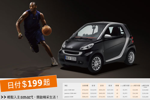 引領時尚、帶動潮流,以「低排污、低油耗、低噪音」屢獲國內、外環保節能首獎的都會微型兩人小車smart fortwo,自今年初小改款在台發表上市後,其嶄新外型、鮮豔車色再次成功擄獲所有人的目光。NBA球壇超級巨星小飛俠Kobe Bryant,更是為甫於六月推出的smart fortwo night orange「夜光橘」 限量特仕車款聚焦代言,長人矯健身手,更顯smart空間充沛、生活樂趣多變的一面。