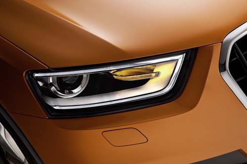 Q3採用了Audi家族式的大尺寸盾型水箱罩,在水箱罩兩側也裝上了大型的進氣口,而Audi十分注重的照明設計也出現在Q3車上,Xenon Plus頭燈以HID為主要照明光源,Audi十分特別的DRL日間行車燈則採用了導引光條的設計,僅需兩具小型LED燈即可點亮環繞頭燈組的U型光條,不僅保留了Audi的造型特色,而更低的耗能亦是此一設計的重點;此外,Audi也準備了自動遠光燈與主動轉向頭燈做為選用配備。尾燈部份亦採用了相同的LED導引光條技術,作為小燈的導引光條僅使用兩個LED,方向燈則由21個LED組成,煞車燈則使用18個LED。由於整個燈座以紅色塑料製作,在燈組關閉時尾燈會呈現非常漂亮的深紅色,提昇了車輛的外觀質感。