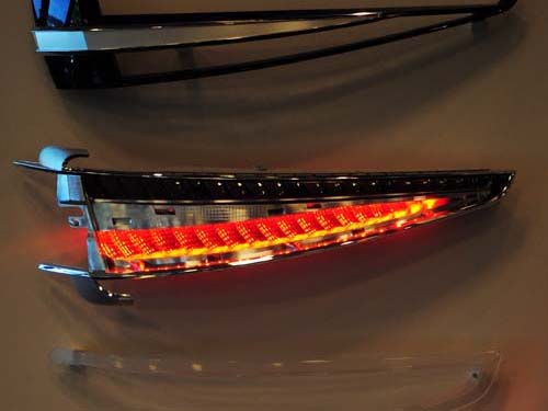 | 從分解組件可看出新一代LED燈組的複雜設計,倒車燈使用獨立模組,煞車燈與方向燈則安裝在第二層組件上,最外層的導引光條則是另一個獨立設計。 |