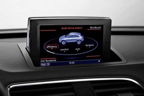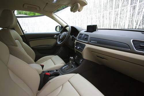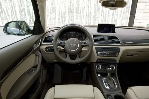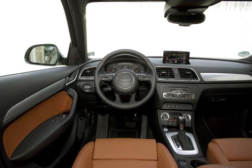 在內裝部份,Q3採用了一套全新的設計,運用弧線與曲面的造型讓內裝看來不像過去Audi那般死板,而且一看就可得知與A6、A7等新車有著相同的血緣,位於中控檯頂端的多功能螢幕是此車各項裝備的控制核心,多數的娛樂、通訊與車輛設定等功能都必須透過此一螢幕進行。位於正中央的則是音響與MMI的控制按鍵群,下方一排按鍵則是包括Audi Drive Select、倒車雷達、停車輔助系統與ESP等裝置的開關,而位於最下方的則是恆溫空調的控制面板,操作邏輯則與現行的A3、TT相似。一項有趣的設計則是在排擋座前方,原本該是車內12V電源差孔的位置,在Q3車上則被引擎啟動按鈕所取代。