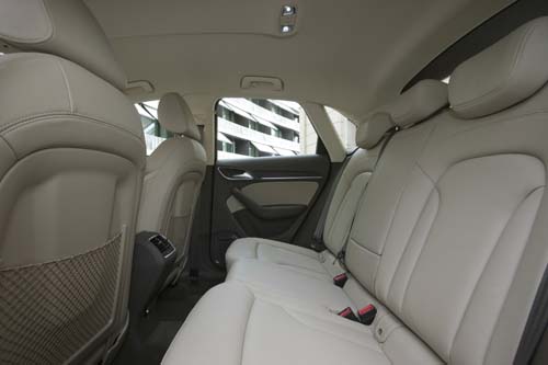 Q3的車內座椅配置則是典型的Audi設計,座椅表面的線條設計十分簡單,但實際乘坐則會發現前座的設計十分強調肩部與腰部的支撐性;在座椅外緣採用一般皮革縫製,中央部位則以Alcantara縫製以提供較佳的抓力,在激烈駕駛時能確保駕駛人與乘客能被固定在座位上。前座的人體工學設計自然是無可挑剔,我們相信大多數人都能輕易調整出舒適的姿勢,不過Q3畢竟是SUV式的配置,駕駛坐姿與房車相比仍然有些偏高。身為緊緻型SUV,Q3在後座空間方面的表現則稍有犧牲,首先是受限於車身寬度,此車並不太適合在後座載滿三名成人,其次後座的膝部空間也稍小,雖然不至於讓成人的膝蓋直接頂著前座椅背,不過也別想翹腿斜躺。至於在行李空間方面,根據Audi所提供的數據,標準容積為460公升,將後座放平之後,行李廂容積則可擴大至1365公升,內部空間的安排亦十分平整開闊,採用硬式的固定行李廂障板則避免了發出噪音的機率,不過略高的行李廂開口有時會對大型物品的進出造成些許困難。