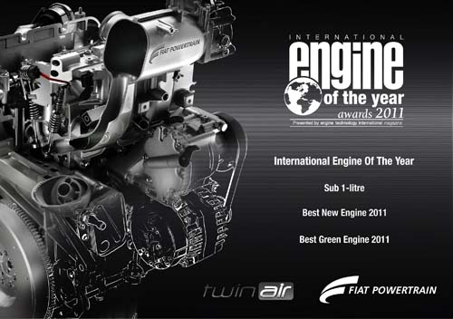 今年這具引擎得到大獎,證明了Fiat在動力系統方面的卓越技術,去年奪得大獎的是Fiat的1.4 MultiAir引擎,今年則由排氣量縮小的875c.c. TwinAir連莊,無疑是對Fiat TwinAir引擎的肯定。Fiat發展的MultiAir技術藉著一些巧妙的設計降低油耗、提昇輸出,而且消費者無需額外支付更多的保養費用,而由於排氣量極小,此一引擎的體型也十分嬌小(307×500×596mm)重量僅有85公斤,十分適合小型車使用。不過從級距入圍引擎來看,傳統內燃機引擎的地位已經開始動搖,除了混合動力引擎之外,電動馬達也開始侵入年度引擎大獎,以後是否會追加電動馬達獎項,或是讓馬達與引擎同廠競技,十分值得玩味。