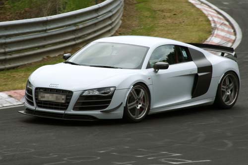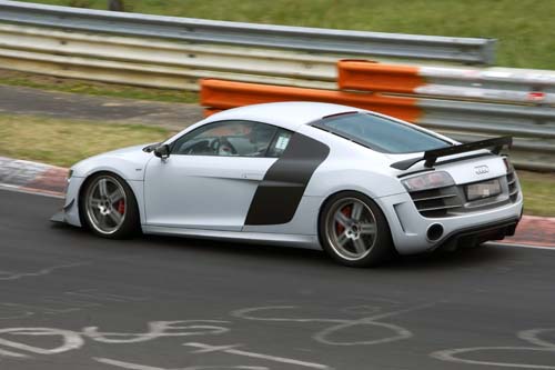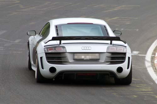 我們在紐柏林取得了這部車的照片,雖然猛一看會讓人覺得這不過是限量333部的尋常R8 GT,但仔細看看這些照片,圖中的車輛絕不是下場練練單圈成績而已,這部測試車裝有非常詭異的追加前下擾流與尺寸造型都更誇張的後擾流板,再加上前後輪拱邊緣追加的固定機構,我們肯定這部車絕不單純。