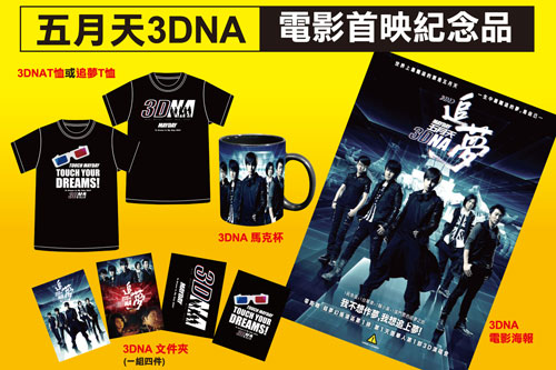 套餐內容提供:五月天演唱會VIP門票及[追夢3DNA]首映會門票,真旅網將與全球首映會同步,在秀泰今日數位影城包下300席的首映會專場,還有3DNA電影商品限量提供顧客。超值獨家套餐組合即將在2011年8月13日正式開賣,數量有限,先搶先贏。據真旅網表示,新馬港澳等地的海外五迷都正密切注意真旅網開賣時間。